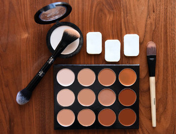 Verschillende tinten bruin, los transparant poeder, platte borstel, ronde borstel,